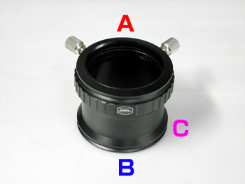 市販のシュミットカセグレン鏡筒に50.8mmの接眼アクセサリーを接続するためのアダプターです。ステンレス製のノブの大きな固定ねじ二本でバネ板を収縮させ、いかなるアイピースでも瞬時に固定します。厚さ約53mm。